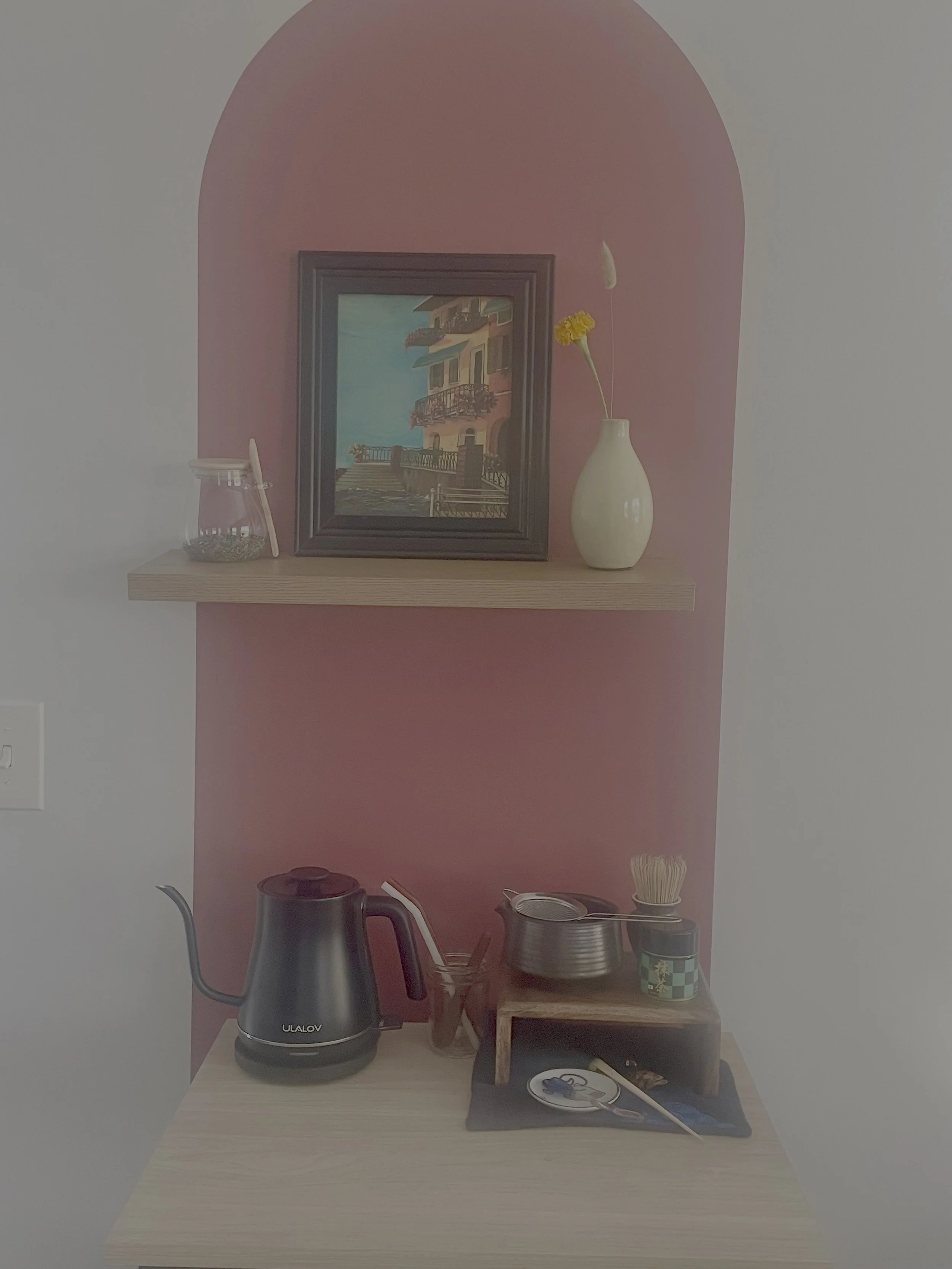 I’ve always had an interest in creating cozy spaces that are representative of me. I’m proud of this coffee and tea bar with the peel and stick arch (still renting over here!) and added a wooden shelf.