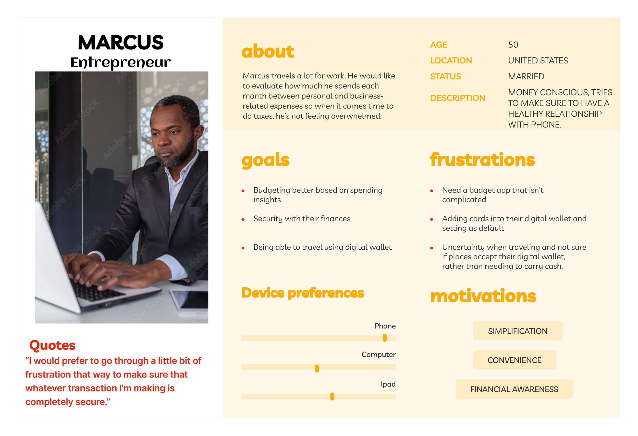 As a self-made entrepreneur, Marcus travels a lot for business and needs a system in place to monitor his spending between personal and business expenses.